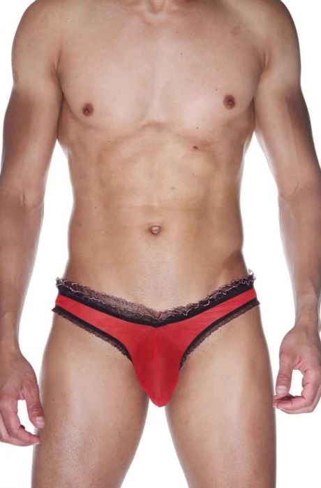 Мужские трусы-слипы из тонкой полупрозрачной ткани, со сборкой на ягодицах. Окантованы двойной рюшей.