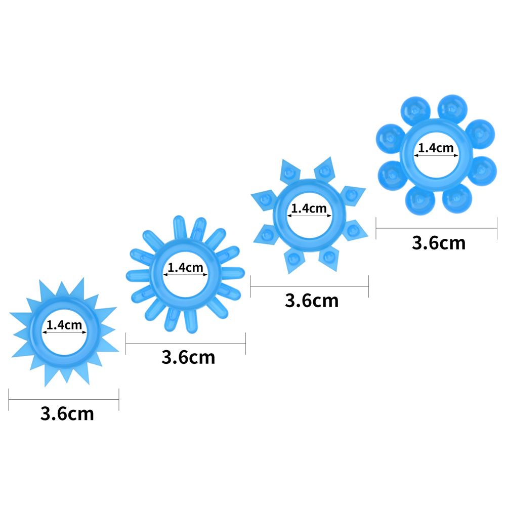 Набор из 4 эрекционных колец. Светящихся в темноте. В состав материала входит специальный не токсичный порошок, который позволяет излучать синий цвет при наступлении темноты! Игрушка должна находиться на свету в дневное время для достижения наилучшего эффекта свечения ночью. Внутренний диаметр - 1,4 см.