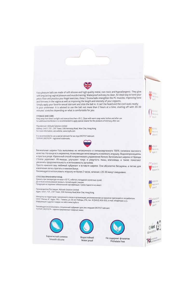 Вагинальные шарики Futa выполнены из нетоксичного и гипоаллергенного 100% силикона высокого качества. На конце есть веревочка, позволяющая легко вводить и извлекать игрушку. Водонепроницаемы и просты в уходе. Идеальный способ попрактиковать упражнения Кегеля. Вагинальные шарики от бренда L’Eroina укрепляют ЛК-мышцы, улучшает тонус и упругость мышц влагалища, а также помогают увеличить продолжительность и интенсивность оргазмов. Просто нанесите ваш любимый лубрикант и вставьте шарики. Они абсолютно бесшумны, а петлю для извлечения легко спрятать в нижнем белье. Рекомендуется использовать игрушку не более 2 часов, начиная с 20-30 минут ежедневно. Рабочая длина - 6 см.